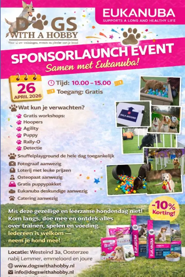 Goed nieuws! Wij zijn trots om aan te kondigen dat Eukanuba onze nieuwe sponsor is. Dit vieren we met een speciaal Sponsor Launch Event op Zondag 26 april. Tijdens deze feestelijke dag organiseren we diverse gratis workshops voor honden, een voedingslezing, leuke activiteiten en exclusieve aanbiedingen. Een perfecte dag voor hondenliefhebbers, puppy-eigenaren en sportieve combinaties van elk niveau.